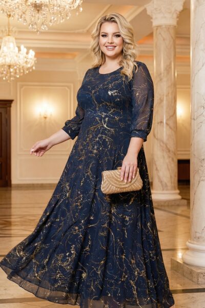 (veľ. 50) Dlhé šaty so zlatými špirálami tmavomodré