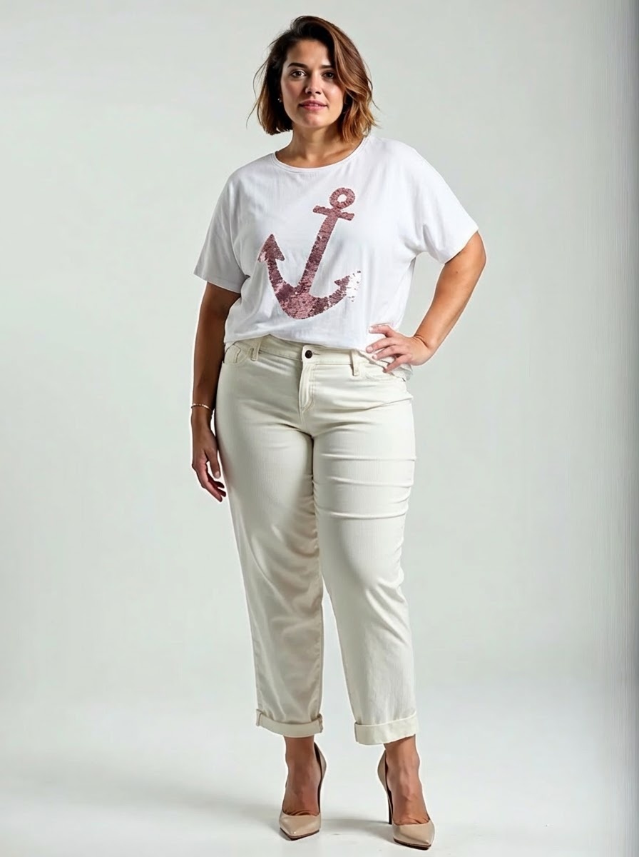 Toto plus size tričko s kotvou vyzerá skvele s džínsami, bielymi nohavicami alebo letnými nohavicami v béžovej či pieskovej farbe. Na leto ho môžete doplniť sandálmi, espadrilkami alebo pohodlnými teniskami. Vďaka námorníckemu motívu sa výborne hodí aj k pruhovaným kúskom alebo tmavomodrým doplnkom.