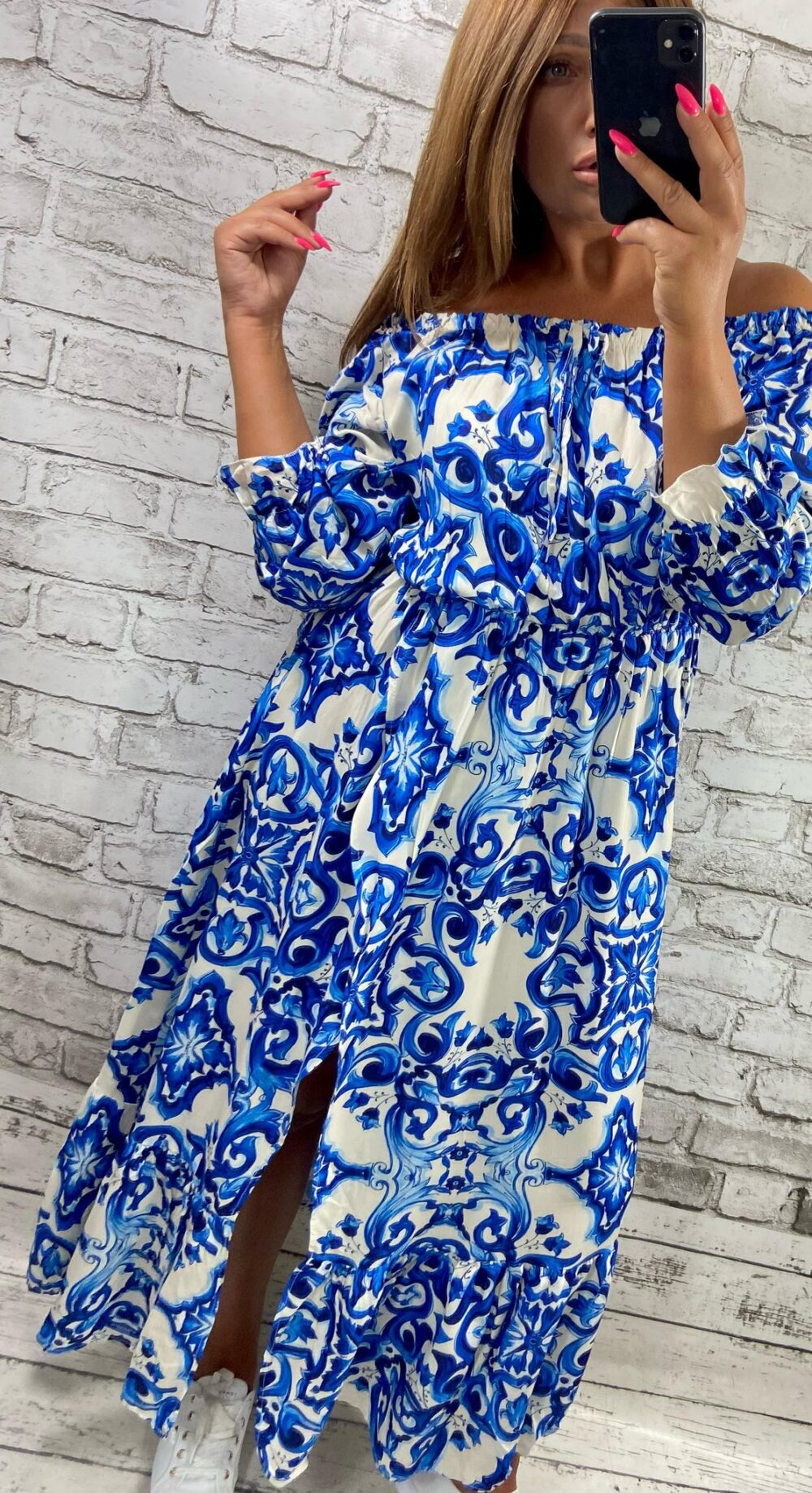 Tieto maxi šaty sú stelesnením letnej elegancie – pohodlné, ľahučké a pritom neuveriteľne efektné. Zaujímavý modrobiely vzor pripomínajúci portugalské azulejos (dekoratívne keramické dlaždice) pôsobí umelecky, elegantne a má nádych južanskej, dovolenkovej atmosféry. Vďaka elastickému výstrihu a romantickému strihu budete vyzerať žensky a cítiť sa slobodne. Šaty sú ideálne na letnú svadbu, večeru v prímorskej reštaurácii, prechádzku historickým centrom, koktail párty na terase aj romantický víkend v rezorte.