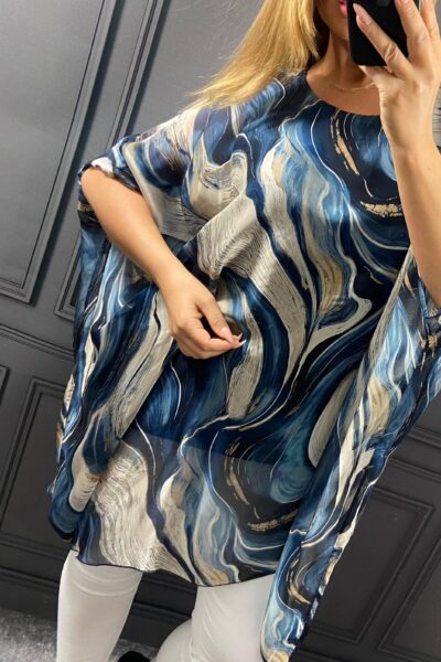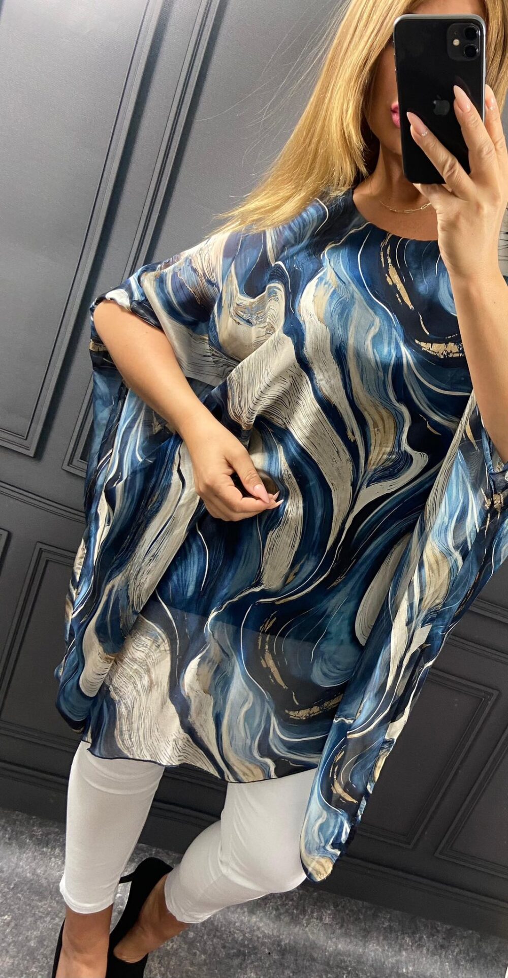 Táto modrá tunika s podielom prírodného hodvábu je ako stvorená pre ženy, ktoré túžia po voľnom, ale elegantnom a zaujímavom strihu. Je ľahká, jemne priesvitná a pôsobí veľmi žensky. Či už ju zvolíte ako minišaty alebo ako tuniku k nohaviciam, vždy v nej zažiarite. Vďaka príjemne padavému kaftanovému strihu a elastickej podšívke sa dokonale prispôsobí postave.