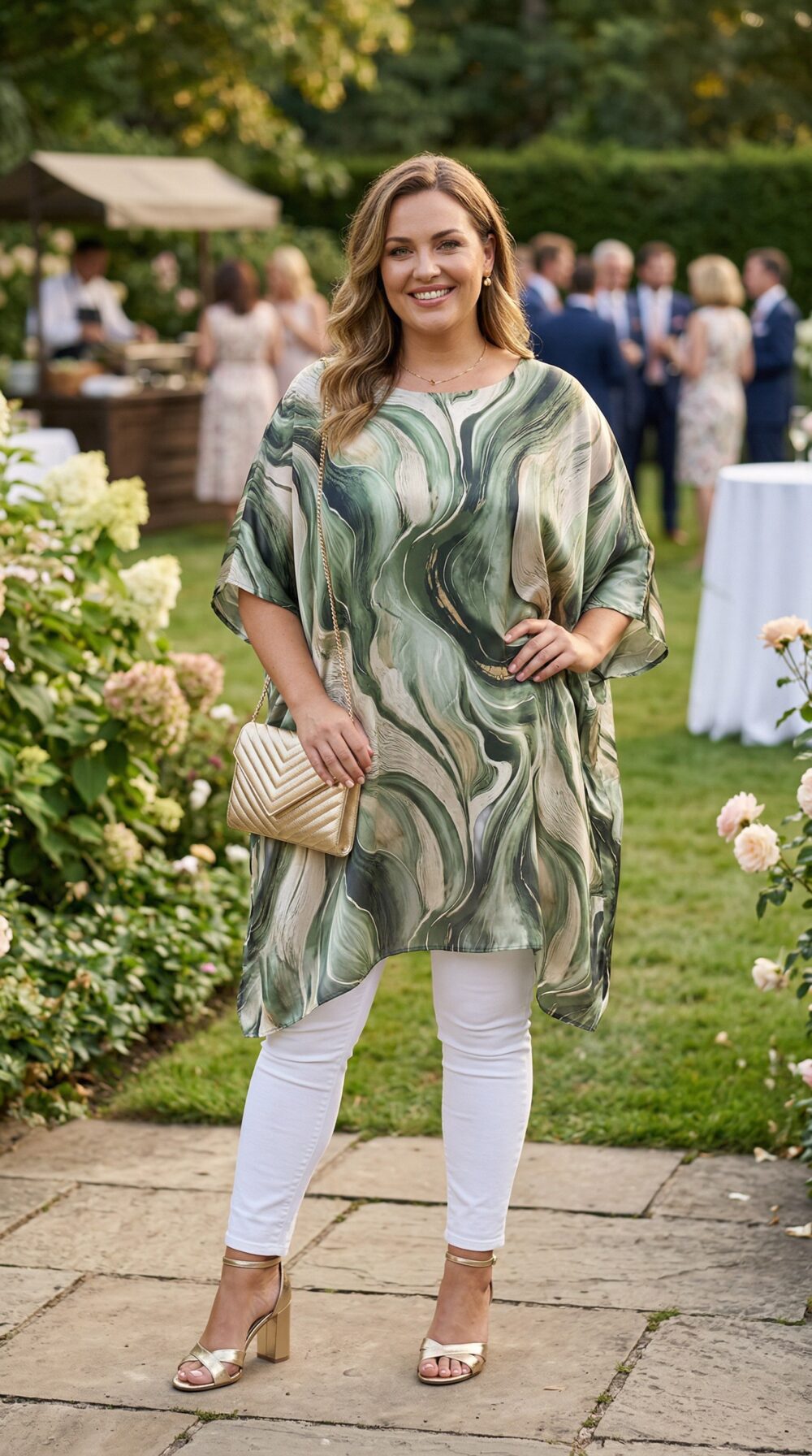 Vzdušná tunika v zemitých zelených tónoch s abstraktnou potlačou prináša ženskosť, eleganciu a prirodzený šarm v jednom kúsku. Jemné prelievanie zelenej, béžovej a tlmených zlatistých línií pôsobí harmonicky a krásne rozžiari celkový outfit. Tento model sa hodí na záhradné oslavy medzi kvetmi, letné večery, prechádzky v letoviskách, na koncert pod holým nebom, alebo na stretnutia s priateľkami.