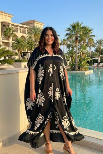 Výrazná čierna, ktorá pôsobí elegantne a zároveň uvoľnene – tento kaftan si zamilujete na prvé oblečenie. Kontrastná smotanová potlač na tmavom podklade mu dodáva originálny charakter a vďaka extra voľnému strihu krásne splýva a pracuje v pohybe. Skvele sa hodí na letné dovolenky, pláž, wellness pobyty, ale aj na neformálne večerné posedenia či prechádzky pri mori.