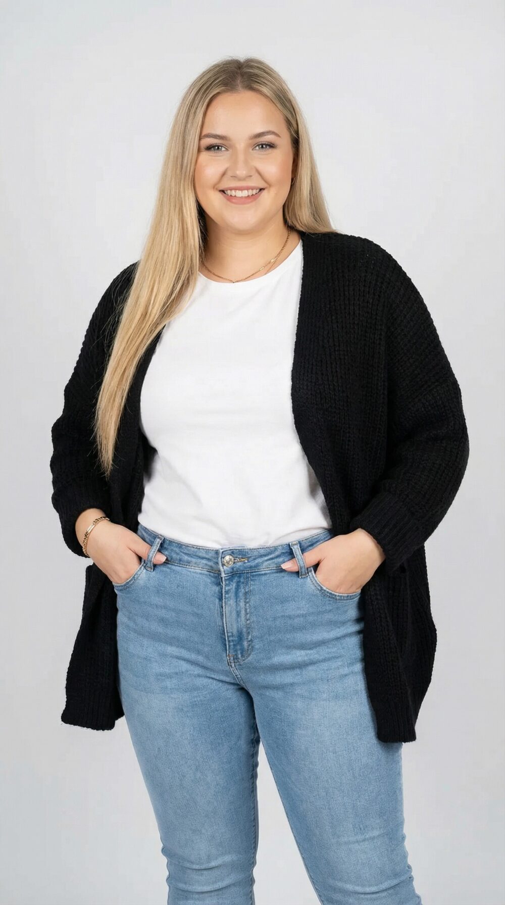 Jednoduchý, elegantný a vždy štýlový. Čierny pletený kardigán patrí medzi univerzálne kúsky, ktoré využijete počas celého roka. Voľný, otvorený strih pôsobí uvoľnene a lichotí postave, zatiaľ čo jemne hrubšia pletenina dodáva pocit pohodlia a tepla. Praktické vrecká dotvárajú celkový vzhľad a pridávajú na funkčnosti.