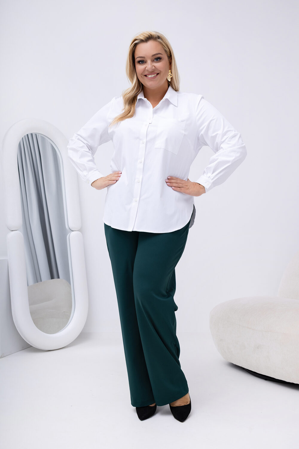 Jednoduchosť, elegancia a nadčasovosť v jednom – biela košeľová blúzka je kúskom, ktorý nikdy nesklame. Vďaka priedušnej bavlne s elastanom pôsobí jemne a príjemne na pokožke, prispôsobí sa postave a poskytuje maximálne pohodlie počas celého dňa. Rovný strih končiaci v oblasti bokov lichotí krivkám a nepôsobí ťažkopádne.
