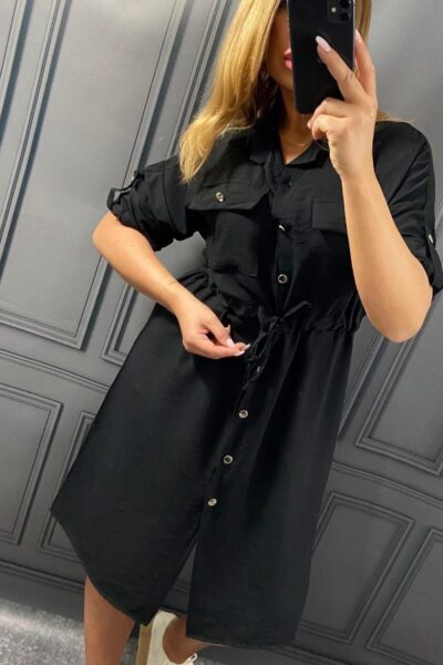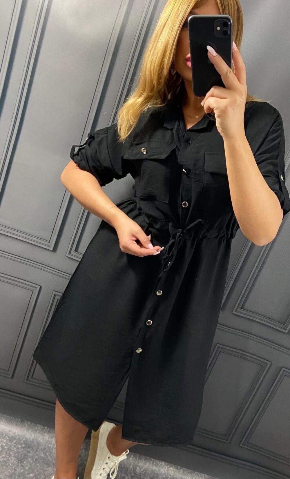 Tieto čierne košeľové šaty v plus size veľkosti pôsobia upravene, žensky a zároveň uvoľnene. Vzdušný strih a jemne splývavý materiál vytvárajú prirodzený pohyb pri chôdzi, zatiaľ čo sťahovanie v páse pekne pracuje s postavou. Šaty sa hodia odí sa na bežné nosenie, do práce aj na neformálne stretnutia.
