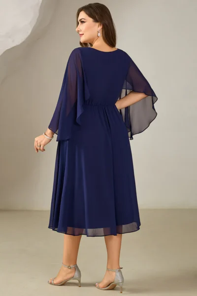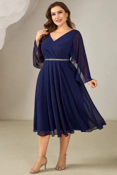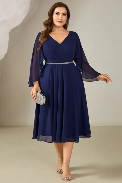 Elegantné tmavomodré midi šaty s ozdobným pásom spájajú slávnostný vzhľad s príjemným nosením. Šifónový materiál pôsobí ľahko, jemne splýva a dodáva šatám vzdušnosť. Strih je navrhnutý tak, aby zvýraznil ženskú siluetu, no zároveň poskytol komfort pri pohybe. Vhodné ako šaty pre svadobnú hostku, na rodinné oslavy, spoločenské podujatia či formálnejšie večerné príležitosti.