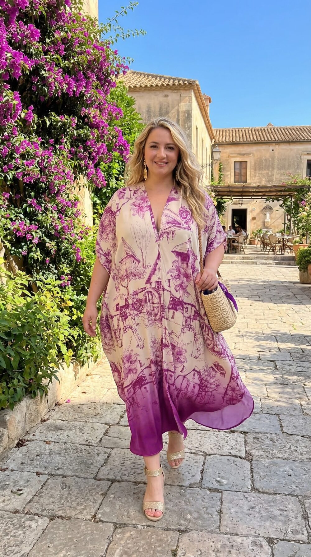 Nežný, vzdušný a pritom výrazný – tento kaftan v jemných fialových tónoch pôsobí ako malé umelecké dielo. Potlač pripomína romantické scenérie a kresby starých miest, ktoré sa smerom dole rozplývajú do sýtej fialovej. Je to kúsok, ktorý si zamilujete na prvé oblečenie – pohodlný, lichotivý a neskutočne ženský. Skvele sa hodí na dovolenku pri mori, kde ho môžete nosiť cez plavky, ale aj na letné prechádzky mestom, posedenia v kaviarni, večerné promenády či záhradné oslavy. Vďaka svojej elegancii ho pokojne využijete aj na neformálne rodinné udalosti alebo letné oslavy.