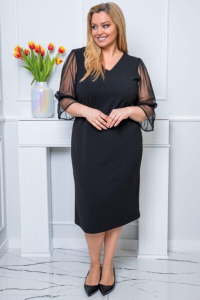 Plus size čierne šaty s klasickým puzdrovým strihom a výraznými tylovými rukávmi pôsobia elegantne a zároveň moderne. Kontrast hladkého tela šiat a jemne priesvitného tylu vytvára vyvážený celok, ktorý nepôsobí fádne ani prezdobene. Využijete ich na rodinné oslavy, večeru v reštaurácii, divadlo, kultúrne podujatia, ale aj na formálnejšie pracovné či spoločenské stretnutia.