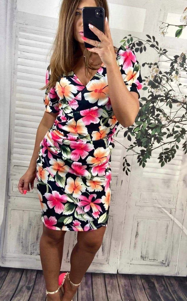 Tieto šaty vás okamžite prenesú do atmosféry tropických dní – výrazná potlač ibištekov na tmavom podklade je ako stvorená na dovolenku, záhradnú oslavu či rande. Elegantný prekladaný výstrih a jemné riasenie krásne tvarujú postavu a opticky zoštíhľujú.