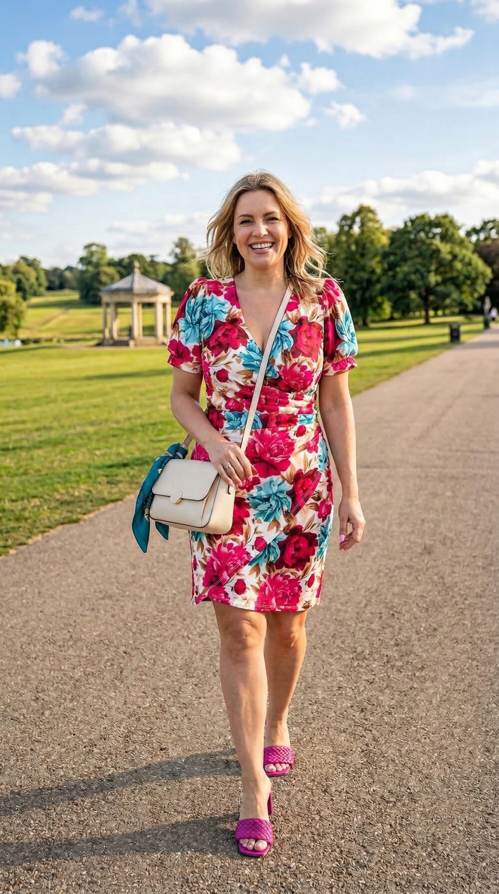 Tento rok dominujú monochromatické doplnky a kovové akcenty. K šatám odporúčame zvoliť krémové alebo telové sandále na blokovom opätku a malú kabelku s kovovým detailom – ideálne v zlatej alebo champagne farbe. Ak chcete byť trendová, siahnite po výrazných náušniciach v tyrkysovom odtieni alebo doplňte outfit o jemné zlaté reťazové šperky. Na chladnejší večer zvoľte jednofarebné sako vo farbe ecru alebo ružovej – ideálne v minimalistickom strihu.