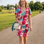 Doplňte telové alebo čierne lodičky pre klasický elegantný look. S ružovou kabelkou alebo clutch taškou v pastelovom odtieni vytvoríte svieži outfit. Jednoduché náušnice alebo jemný retiazkový náhrdelník dotvoria vzhľad bez toho, aby narušili bohatosť potlače.