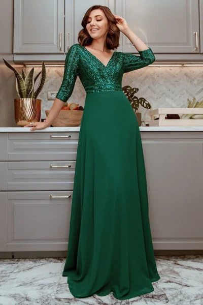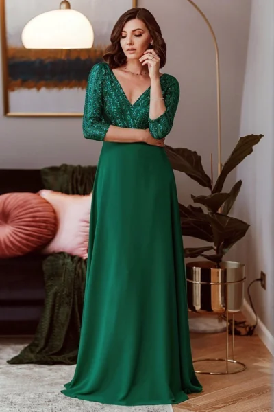 Tieto šaty s flitrami na živôtiku presne ten typ elegancie, ktorý sa hodí na plesy, slávnostné večere, svadby alebo galavečery, kde chcete pôsobiť upravene, žensky a zároveň trochu výnimočne. Smaragdová farba je hlboká, ušľachtilá a pri večernom osvetlení doslova ožíva. Vrchná časť jemne zachytáva svetlo, zatiaľ čo dlhá splývavá sukňa dodáva šatám noblesný charakter. Celý model pôsobí veľmi harmonicky – slávnostný, ale stále elegantne vyvážený.