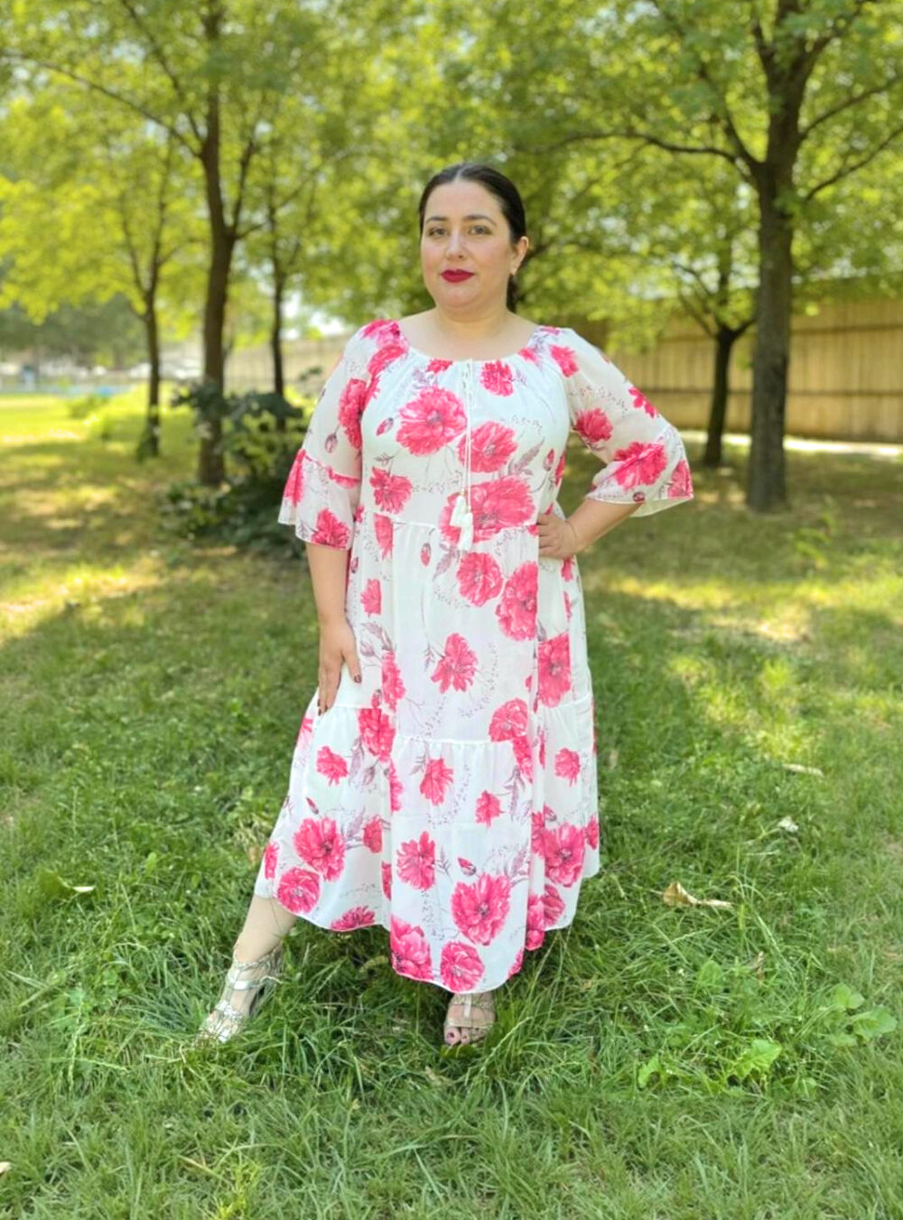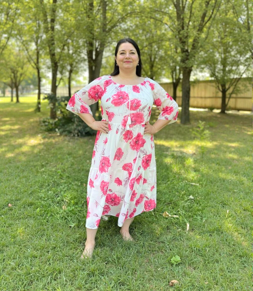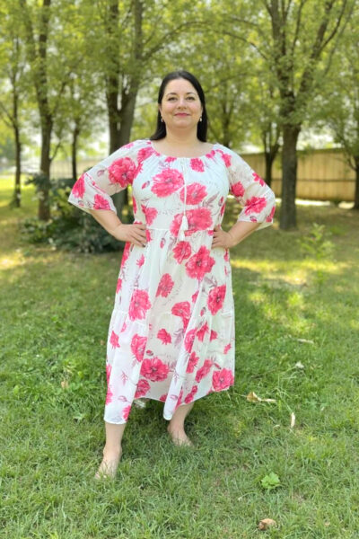 Tieto jemné a romantické šaty s červeno-bielym kvetinovým vzorom sú ideálne na letné dni, keď túžite po pohodlí a ženskom vzhľade zároveň. Vďaka ľahkému materiálu, lichotivému strihu a decentným detailom pôsobia sviežo a zároveň elegantne – či už sa chystáte na oslavu, kávu s priateľkami alebo prechádzku mestom.