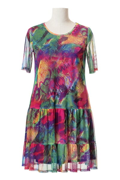 Tieto šaty sú ako malý umelecký zážitok – farebné, živé a plné energie. Pôsobia ľahko, sviežo a majú v sebe hravosť, ktorá sa pekne ukáže pri každom kroku. Stupňovitá sukňa dodáva modelu pohyb a prirodzený šmrnc. Perfektná voľba na dni, keď chcete zažiariť – či už na oslave, párty alebo rodinnej udalosti.