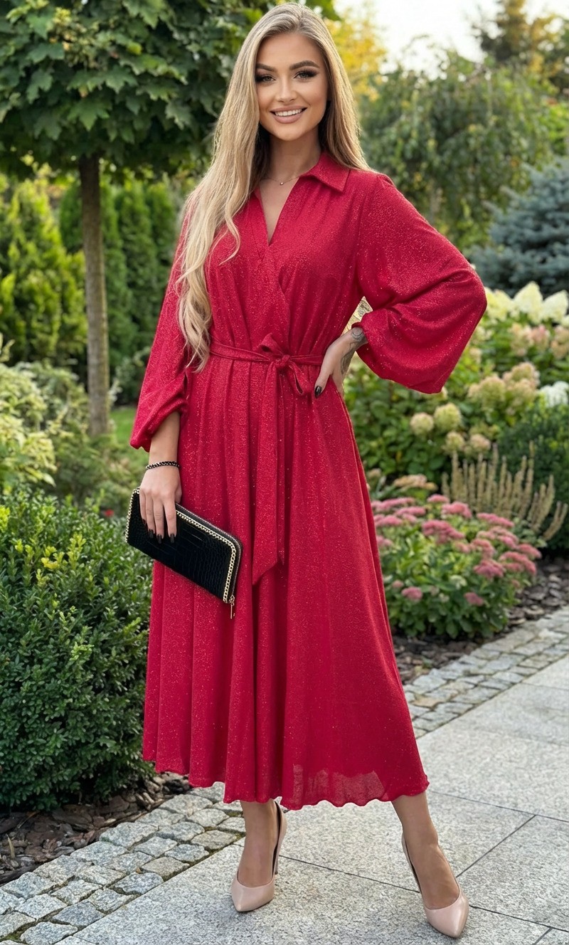 Tieto červené trblietavé šaty sú stelesnením atmosféry – ženské, elegantné a zároveň pohodlné. Ich jemne trblietavý materiál odráža svetlo a vytvára dojem luxusu, ktorý však pôsobí prirodzene a nenútene. Ideálny kúsok na večierky, rodinné oslavy aj párty.