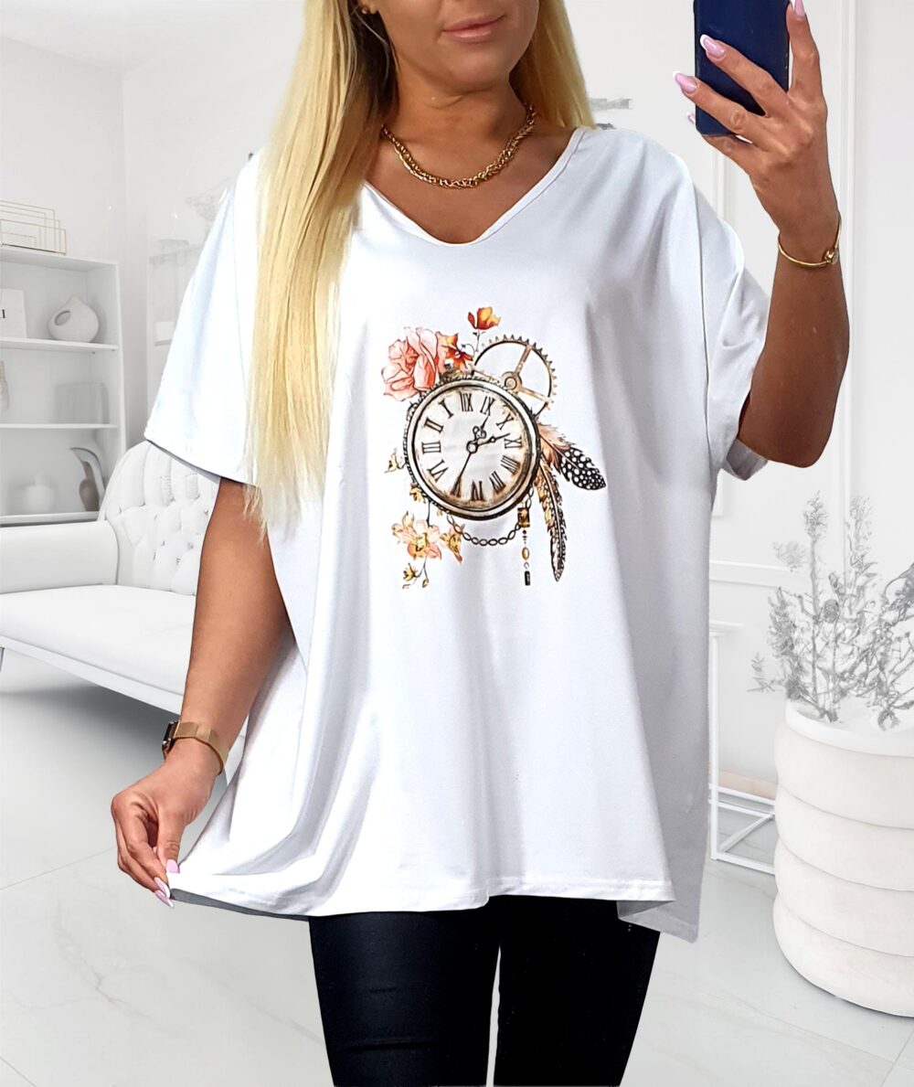 Biele tričko má v šatníku každá z nás, no toto rozhodne nie je obyčajné. Jemná potlač s vintage hodinami a kvetmi mu dodáva ženskosť a osobitý charakter. Je vzdušné, ľahké a veľmi príjemné na nosenie – presne také, ktorý si oblečiete ráno bez rozmýšľania a vždy budete vyzerať upravene. Skvelo sa hodí na bežné dni, do mesta, do práce bez dress codu, na nákupy, cestovanie aj dovolenku.