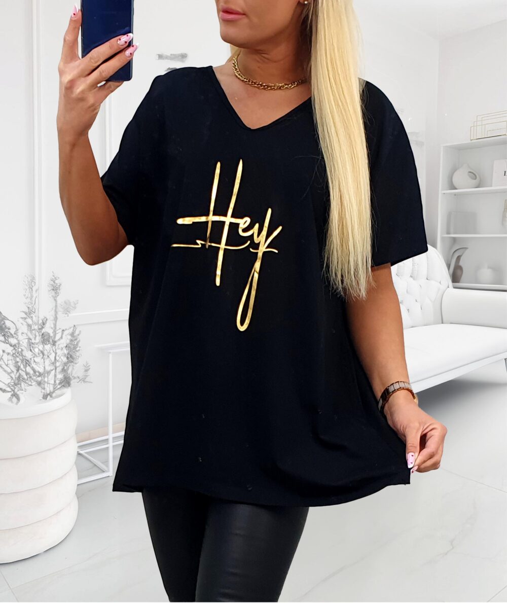 Sú kúsky, ktoré si oblečiete a okamžite máte pocit, že celý outfit pôsobí upravenejšie. Presne takým je aj toto tričko v klasickej čiernej farbe, ktorú oživuje výrazný zlatý nápis „Hey“. Kombinácia tmavého podkladu a lesklého detailu vytvára moderný, trochu mestský charakter. Je to model, ktorý je pohodlný na každý deň, no zároveň má v sebe jemný nádych elegancie.