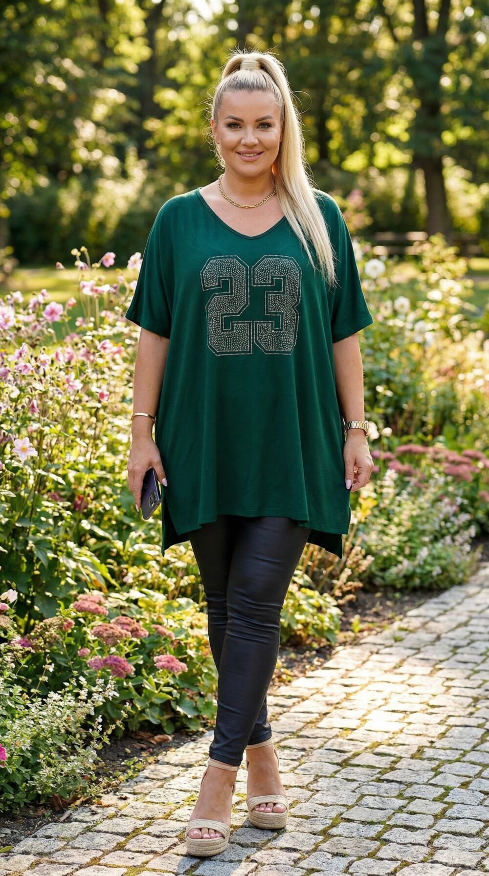 Táto tunika v nadmernej veľkosti zaujme na prvý pohľad sviežou zelenou farbou a výrazným kamienkovým detailom, ktorý dodáva jednoduchému strihu moderný charakter. Príjemne splýva, nikde netlačí a vďaka lesku kamienkov pôsobí upravene a elegantne. Hodí sa na bežné dni v meste, prechádzky, neformálne stretnutia aj na chvíle, keď chcete pôsobiť zaujímavo.