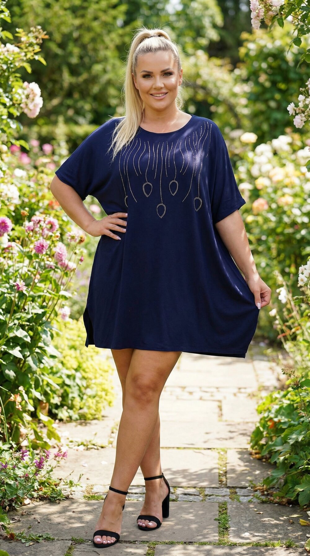 Tmavomodrá tunika s kamienkovým vzorom pôsobí elegantne a veľmi žensky. Farba dodáva celému modelu noblesný charakter a kamienkové línie s listom vytvárajú na prednej časti zaujímavú kresbu. Táto plus size tunika sa hodí na večerné stretnutia, rodinné oslavy, spoločenské podujatia, večere v reštaurácii, kultúrne akcie aj reprezentatívne príležitosti.