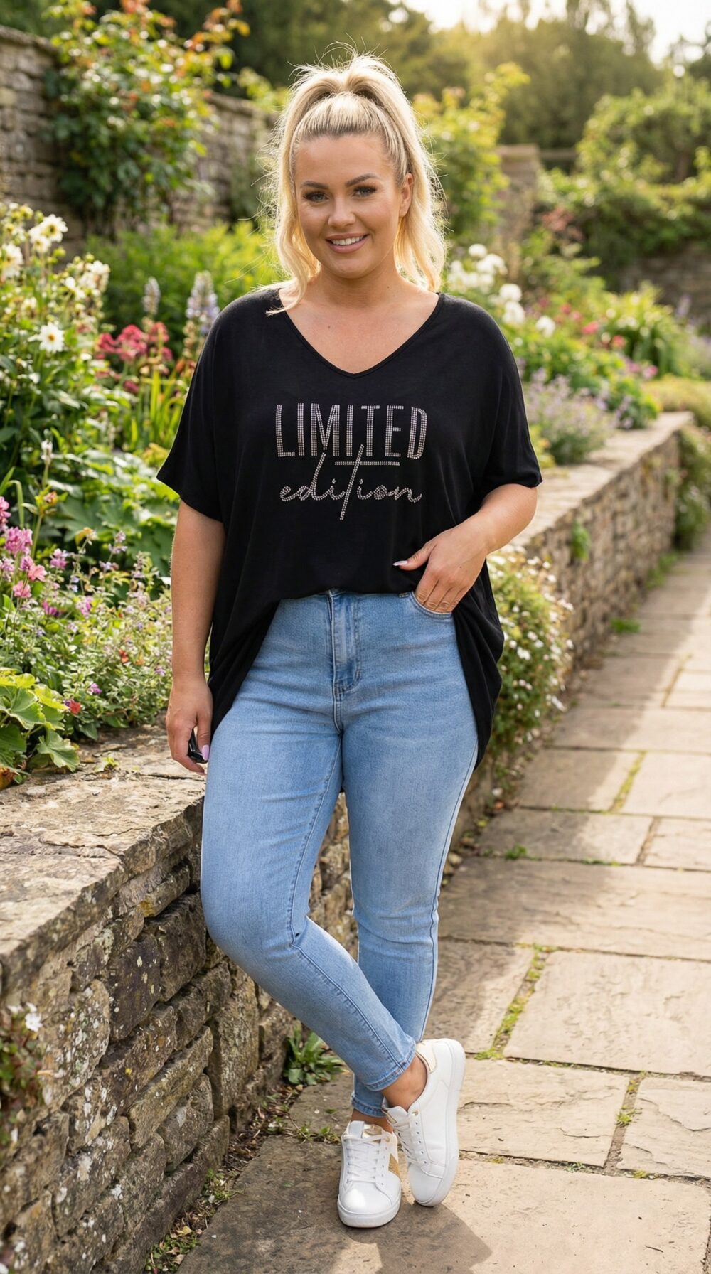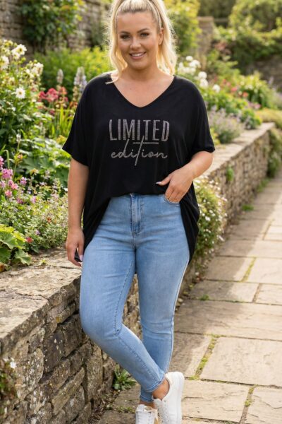 Čierna tunika s kamienkovým nápisom „Limited edition“ zaujme na prvý pohľad. Čierna je istota – vždy pôsobí elegantne – a kamienkový nápis dodáva tunike jemný lesk a charakter. Výraz Limited edition znamená limitovaná edícia, teda niečo výnimočné a osobité. Tunika je ideálna napríklad na pracovný deň v kancelárii, skvele funguje aj na kávu s kamarátkou v meste, víkendové nákupy, ale hodí sa aj na večeru v reštaurácii či menšiu rodinnú oslavu.