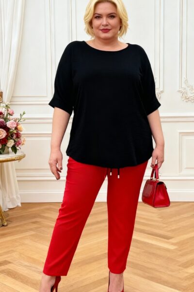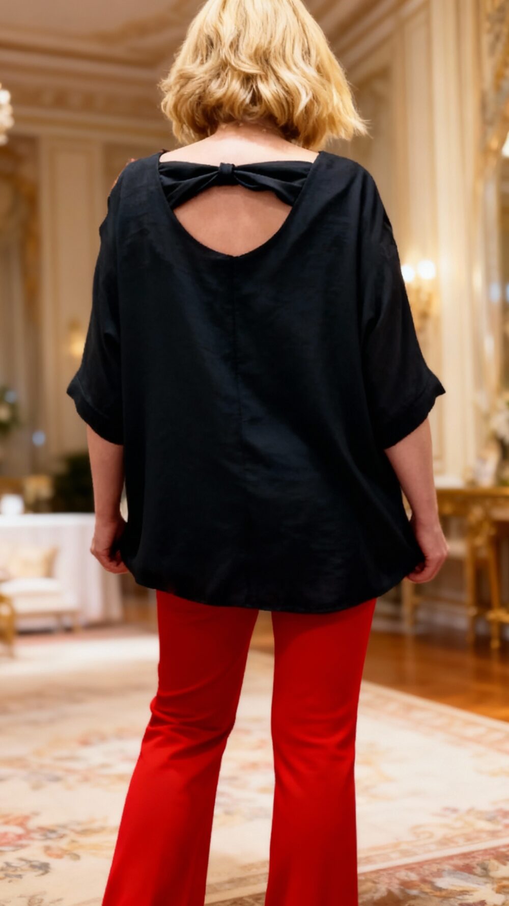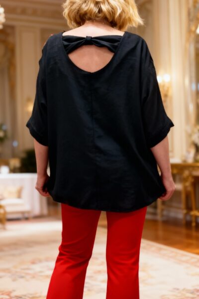 Niektoré kúsky si zamilujete hneď, ako ich oblečiete – a tento top je presne taký. Príjemný, pohodlný padavý, krásne zakryje, čo má, a pritom pôsobí elegantne a sviežo. Vzadu vás prekvapí mašľa na chrbte, ktorá mu dodáva jemný, romantický detail. Stačí ho doplniť nohavicami a ste dokonale upravená – bez stresu, bez námahy.