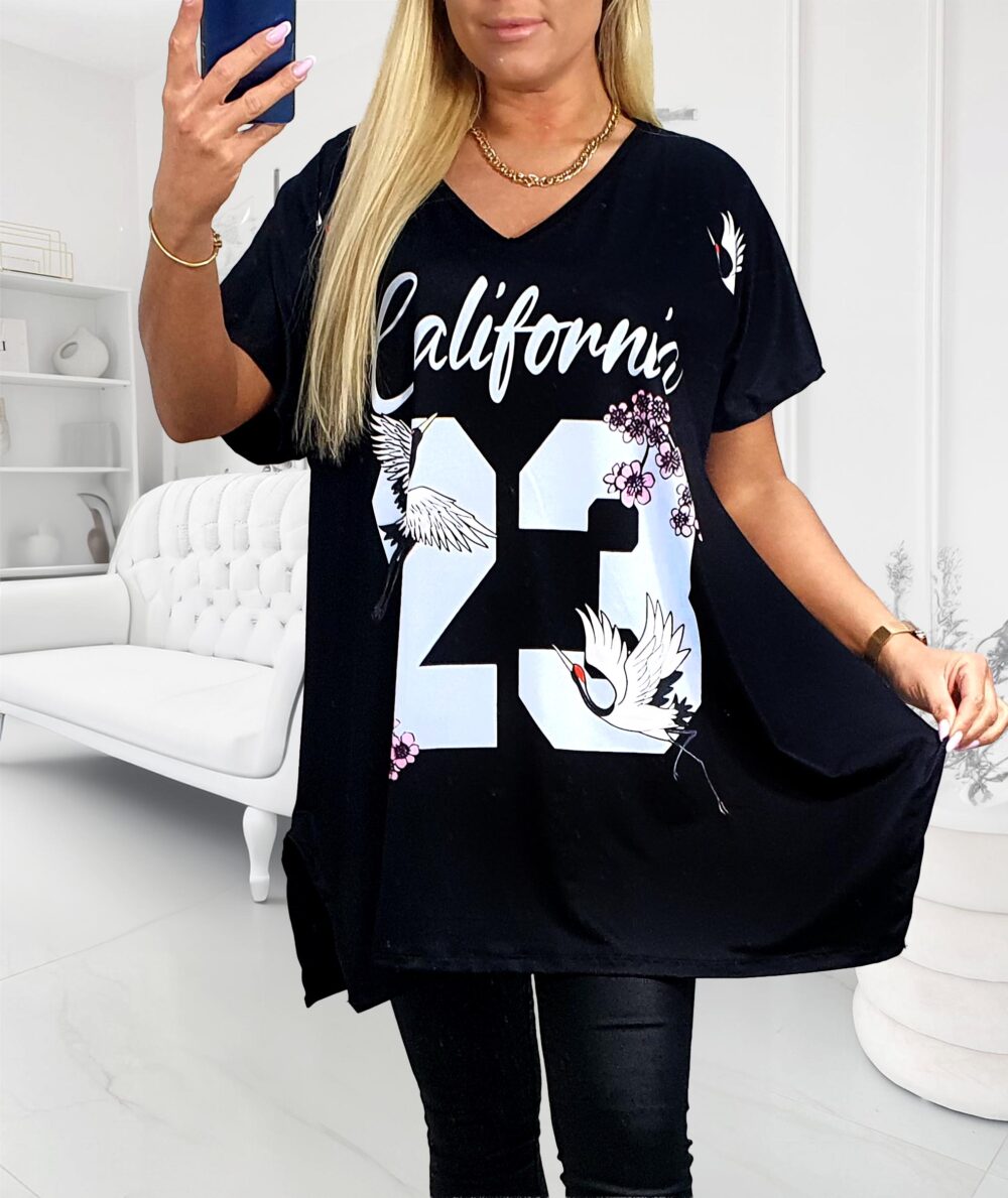 Táto plus size tunika s bielym nápisom California a veľkou číslicou prináša do vášho šatníka nielen pohodlie, ale aj štýl. Výrazná potlač dodáva outfitu energiu a zároveň pôsobí moderne a sviežo. Strih je voľný, príjemný na nosenie a krásne sadne postave bez zbytočného obopínania. Skvelá voľba na bežné dni, do mesta, na nákupy, cestovanie aj pohodové stretnutia s kamarátkami.