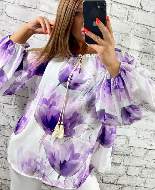 Táto ľahká tunika s romantickým kvetinovým vzorom je ako stvorená pre ženy, ktoré milujú pohodlie a ženský štýl. Krásny vzor, balónové rukávy a dekoratívne viazanie pri dekolte vytvárajú nežný, no zároveň výrazný vzhľad, ktorý zaujme na prvý pohľad.