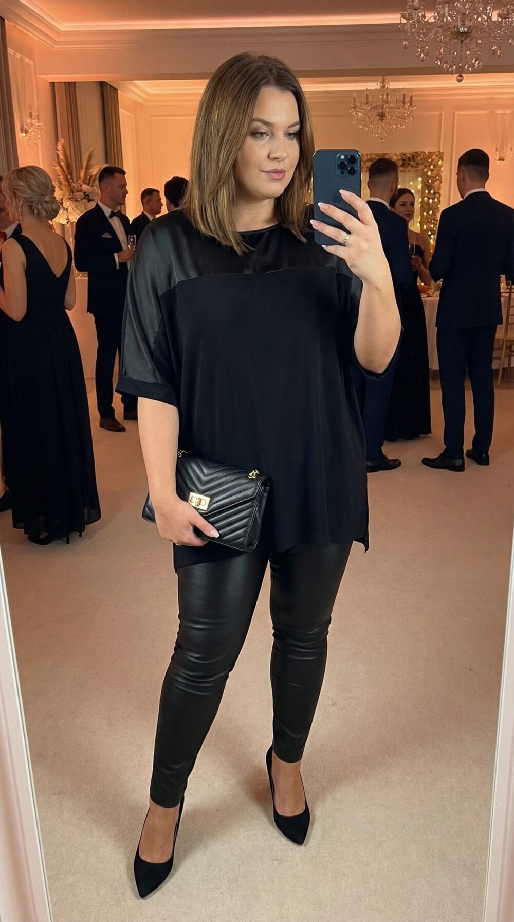 Pre moderný look 2026 ju oblečte k čiernym cigaretovým nohaviciam alebo elastickým legínam a pridajte lodičky s otvorenou pätou v striebornej či šampanskej farbe – kovový tón krásne doplní saténový lesk. Ak chcete mäkší, ženskejší štýl, zvoľte kardigán a krémovú kabelku v tvare vrecúška. Zo šperkov sa hodí výraznejšia zlatá retiazka (ako na fotke) alebo minimalistické zlaté kruhy, ktoré oživia čiernu. Na voľnejší deň ju skúste s bielymi teniskami a štruktúrovanou crossbody kabelkou v karamelovom odtieni.