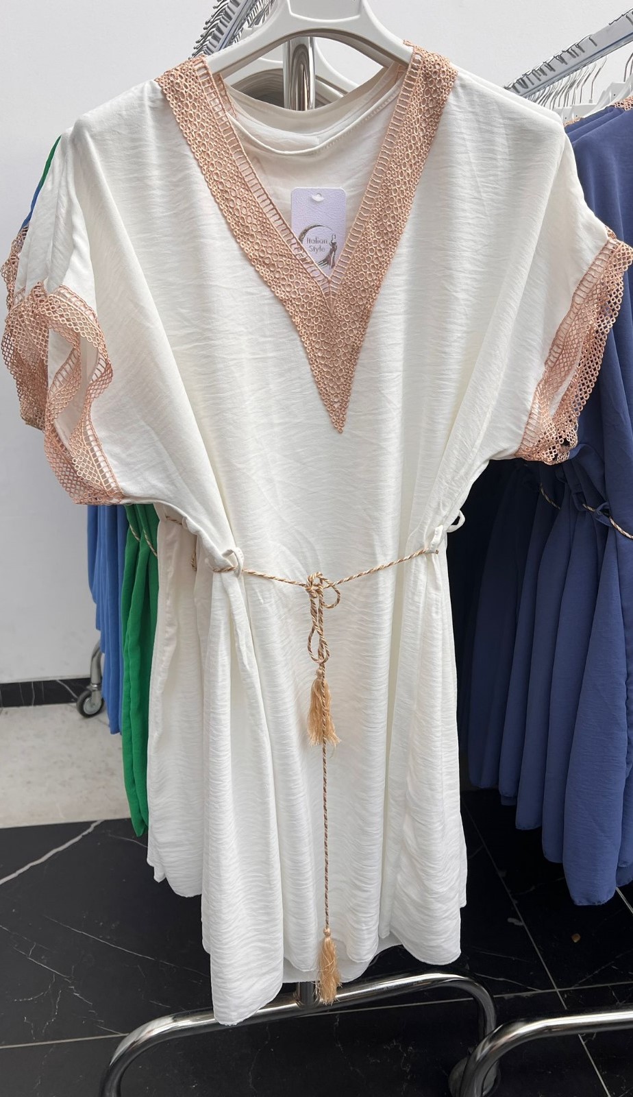 Tieto letné šaty v sebe nesú jemnú antickú eleganciu, ktorá pôsobí pokojne, čisto a veľmi žensky. Voľná, splývavá silueta sa prirodzene prispôsobí postave, zatiaľ čo viazačka v páse ju ľahko tvaruje bez zbytočného obopínania. Vďaka svetlému odtieňu a detailom v béžovom duchu sa hodia na letné prechádzky historickým mestom, dovolenkové večery aj rodinné oslavy pod holým nebom.