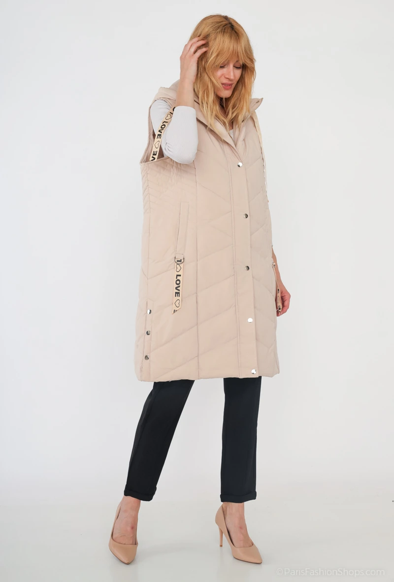 (veľ. 46 a 48) Prešívaná vesta Love s kapucňou a vreckami krémová