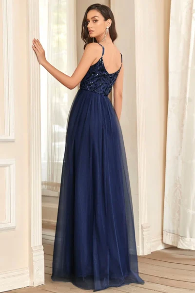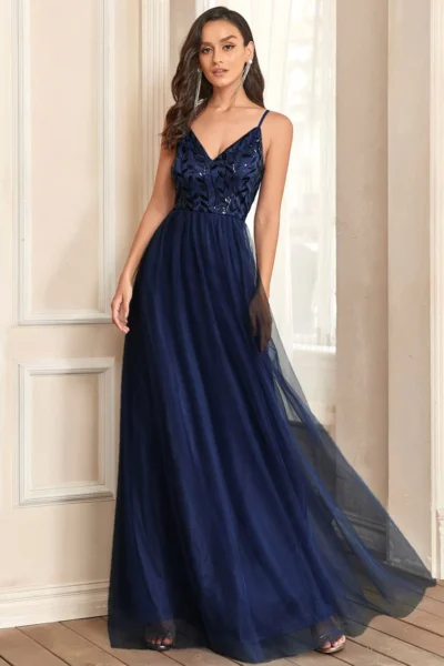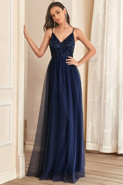 Tieto tmavomodré šaty si rozumejú s leskom – strieborné alebo krištáľové náušnice, elegantné sandáliky a hladká listová kabelka dotvoria spoločenský look. Skvele sa hodia na svadby, plesy či večerné bankety, kde očaríte rafinovanou jednoduchosťou s nádychom trblietavej elegancie.