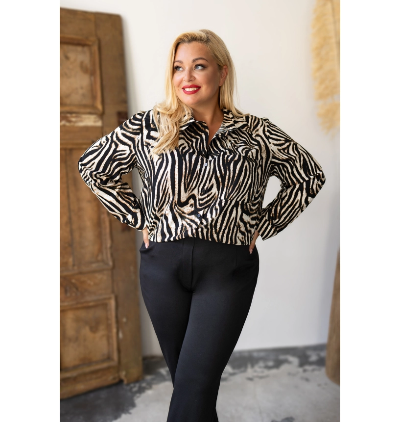 Táto štýlová blúzka s výrazným tigrovaným vzorom je dokonalou voľbou pre ženy, ktoré túžia po originálnom a univerzálnom kúsku. Ideálna na každodenné nosenie aj formálnejšie príležitosti, vďaka svojmu nadčasovému strihu a komfortnému materiálu zaujme na prvý pohľad.