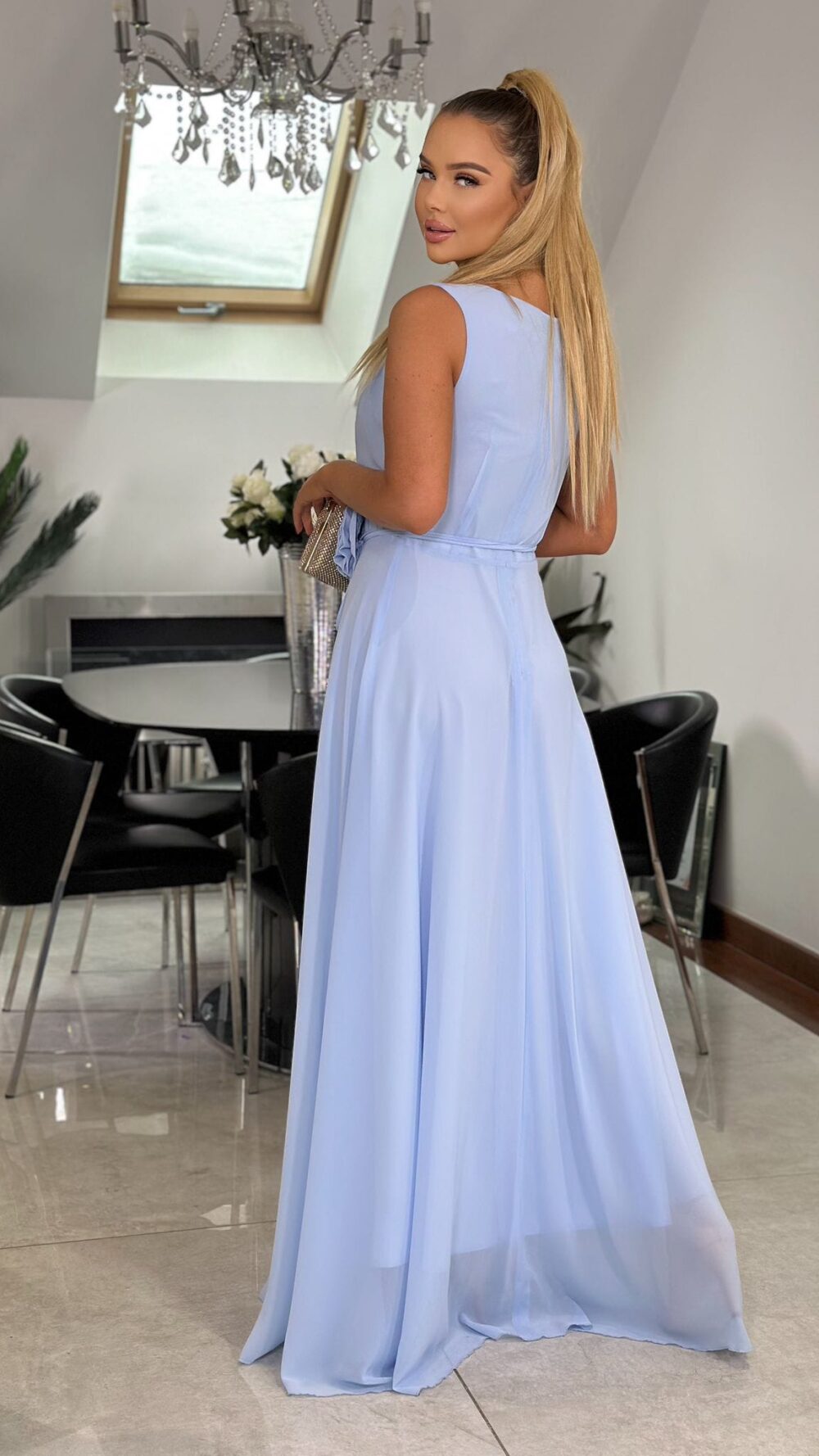 Túžite zažiariť na oslave, svadbe či významnej spoločenskej udalosti? Tieto dlhé nebesky modré šaty sú stelesnením jemnej romantiky a nadčasovej ženskosti. Ich jemná farba pôsobí čisto a sofistikovane, strih lichotí postave a efektný tenký opasok s ružou dodáva šatám výnimočný charakter.