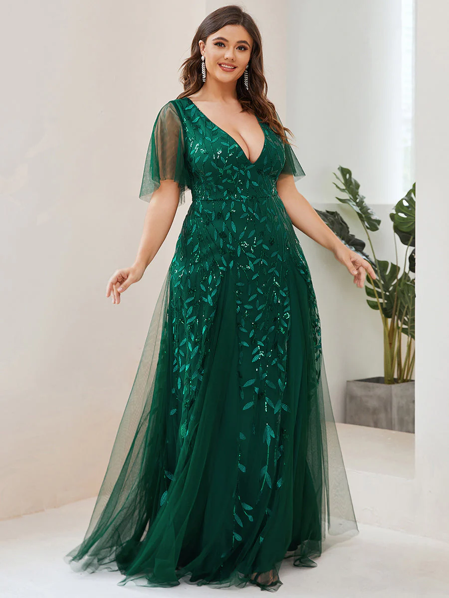 Tento model je dokonalou voľbou pre ženy s plnšími krivkami, ktoré chcú zažiariť na špeciálnych príležitostiach. Šaty vynikajú hlbokým výstrihom do V, ktorý pôsobí rafinovane a zvýrazňuje dekolt. Priehľadné rukávy z jemného tylu dodávajú šatám ľahkosť a sofistikovanosť, pričom poskytujú dostatočné krytie pre komfortné nosenie.