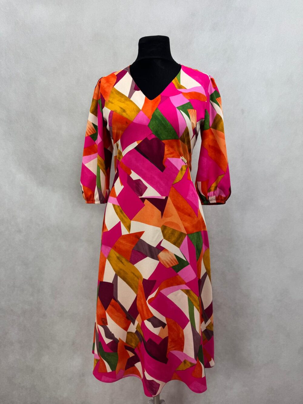 Tieto pestrofarebné šaty zaujmú na prvý pohľad svojou energiou a hravosťou farieb. Výrazný geometrický vzor v odtieňoch fuksiovej, oranžovej, zelenej a krémovej pôsobí sviežo a moderne. Vďaka príjemnému strihu a splývavej viskóze sa šaty nosia ľahko a prirodzene – ideálne na dni, keď chcete byť neprehliadnuteľná, či už v meste, na oslave alebo letnom podujatí.