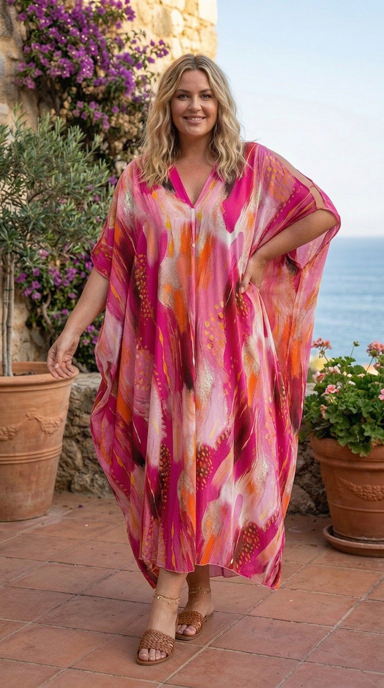 Výrazný kaftan či kaftanové šaty alebo prehoz na plavy, ktorý rozžiari každý letný deň farbou a energiou. Tento model zaujme živou kombináciou fuksiovej, oranžovej a jemných krémových tónov, ktoré sa prelínajú v dynamickej, umelecky pôsobiacej potlači. Uvoľnený široký strih a splývavý materiál vytvárajú pohodlný, vzdušný siluetu ideálnu na teplé dni pri mori aj v meste.