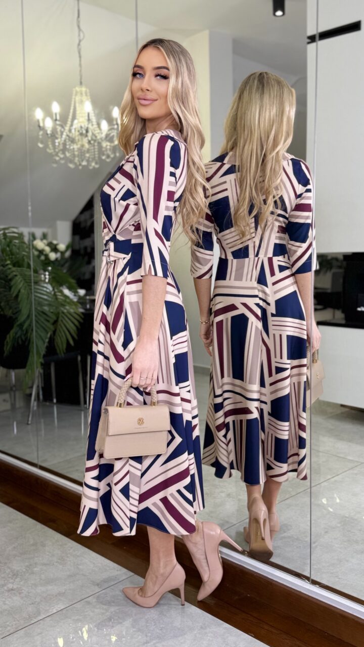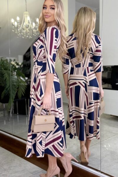 Tieto šaty zaujmú na prvý pohľad dynamickým geometrickým vzorom, ktorý pôsobí moderne a zároveň elegantne. Kombinácia línií a farieb vytvára vizuálne členenie, ktoré odvádza pozornosť od drobných nedokonalostí postavy. Výsledok je upravený, ženský a veľmi nositeľný kúsok. Preto sú šaty ideálnou voľbou na spoločenské príležitosti, oslavy, pracovné stretnutia aj večere.