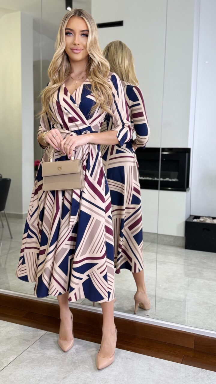 Zavinovacie šaty so striebornou prackou s grafickými vzormi béžové